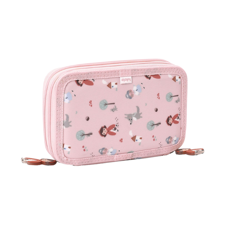 Tutete Estojo Plumier Duplo Floresta Mágica com dois compartimentos, design retro-moderno e exterior impermeável. Ideal para organizar lápis, marcadores e outros materiais escolares. Feito com materiais reciclados e alças em silicone.