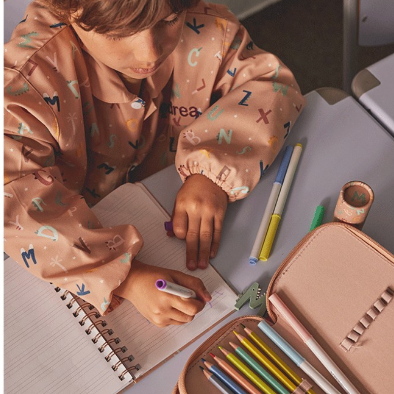 Com dois compartimentos separados por fechos de correr, permite guardar e separar facilmente lápis, canetas, marcadores, borrachas e todos os essenciais escolares. O material exterior impermeável protege contra derrames e humidade, enquanto as alças em silicone facilitam o manuseamento por mãos pequenas.