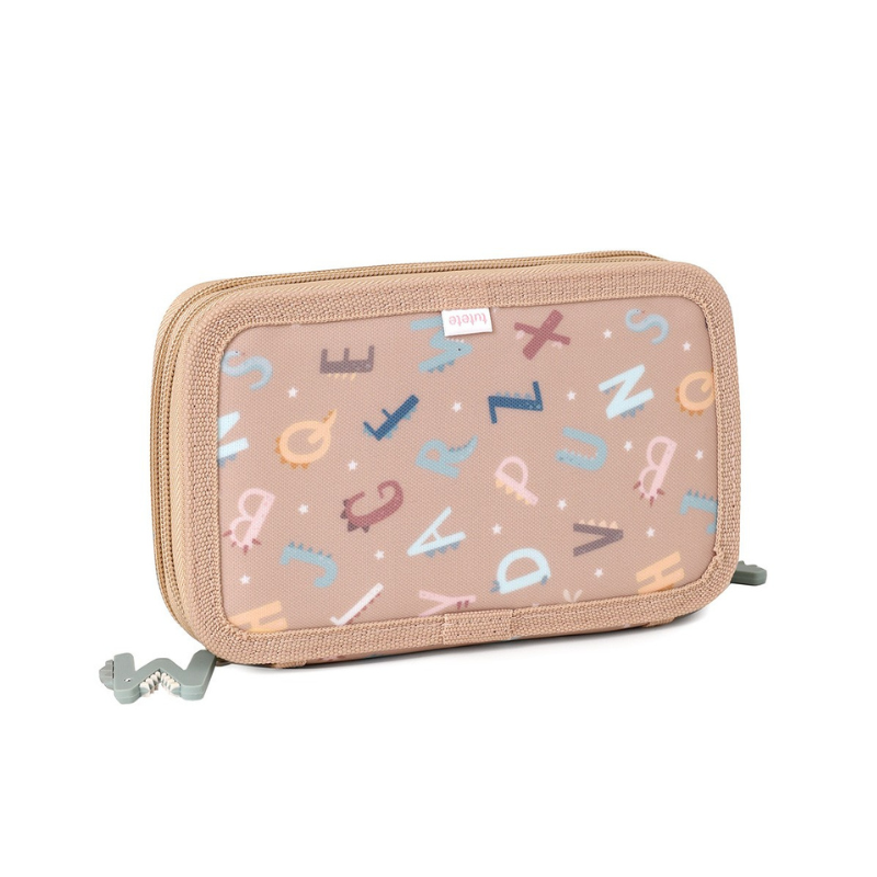 Tutete Estojo Plumier Duplo Letras com dois compartimentos, design retro-moderno e exterior impermeável. Ideal para organizar lápis, marcadores e outros materiais escolares. Feito com materiais reciclados e alças em silicone.