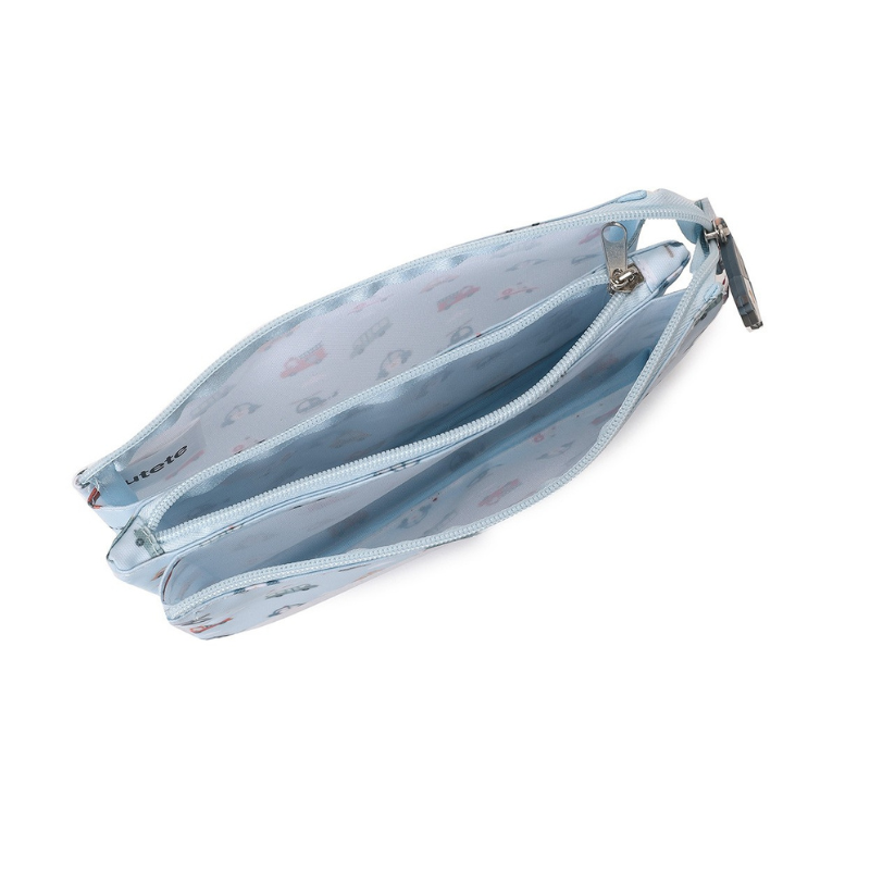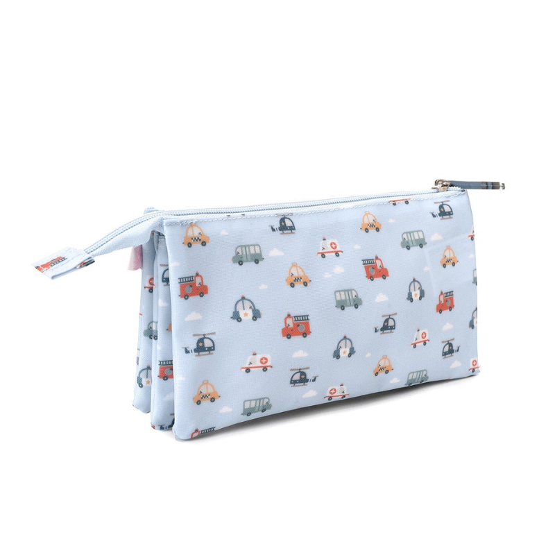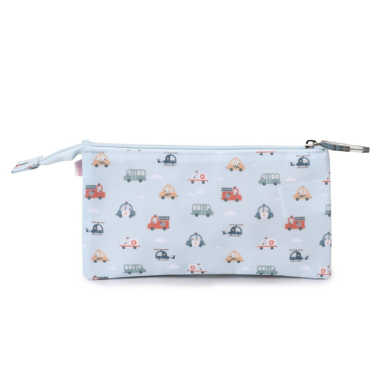 Feito em plástico reciclado (RPET), é uma escolha amiga do ambiente, durável e leve. O estampado colorido com carros torna o estojo único e divertido.