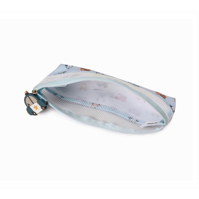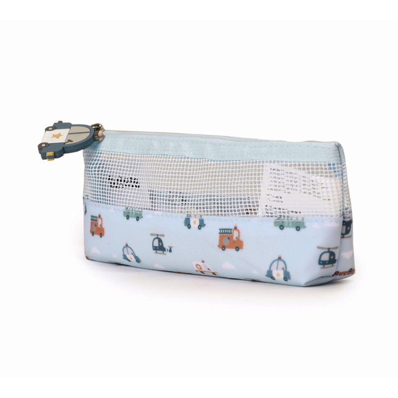 Bolsa infantil para escova de dentes com estampado de carros. Compacta, leve e com malha respirável, ideal para escola, viagens ou atividades fora de casa.