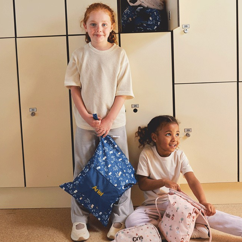Mochila saco leve em tecido com estampado de letras. Ideal para a creche ou jardim de infância - prática, lavável e fácil de identificar.