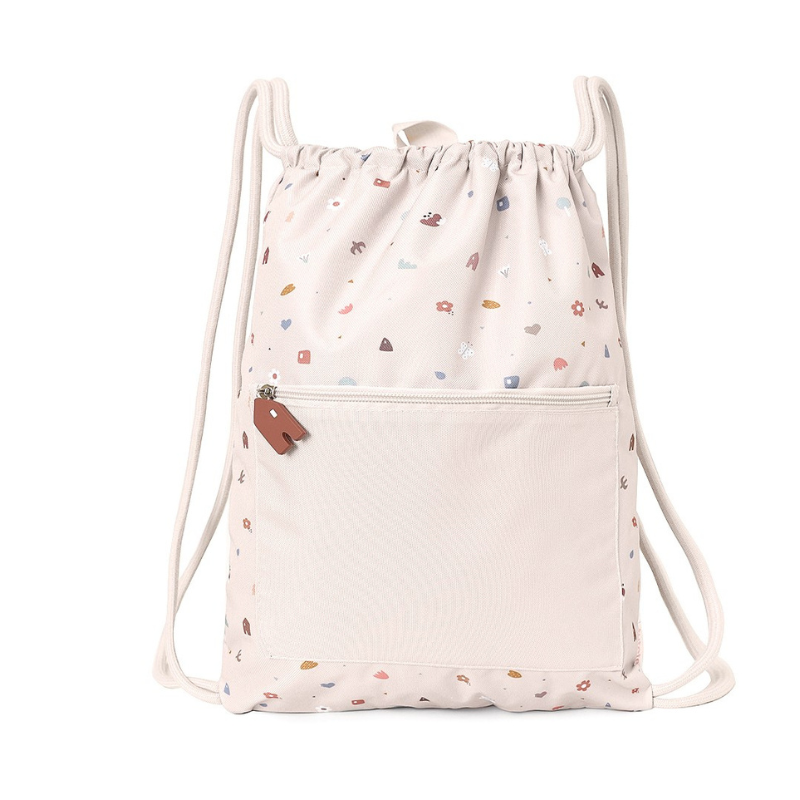 Mochila saco leve em tecido com estampado de letras. Ideal para a creche ou jardim de infância - prática, lavável e fácil de identificar.