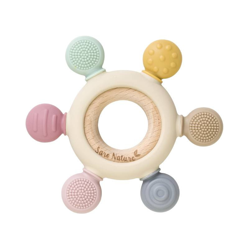 Saro Mordedor Sensorial com um design flexível, geométrico e sem bordas, é ideal para aliviar a dor das gengivas. Feito de madeira de faia e silicone orgânico, é tão macio e agradável que o seu bebé não vai parar de brincar com ele. Recomendado para bebés a partir dos 4 meses.