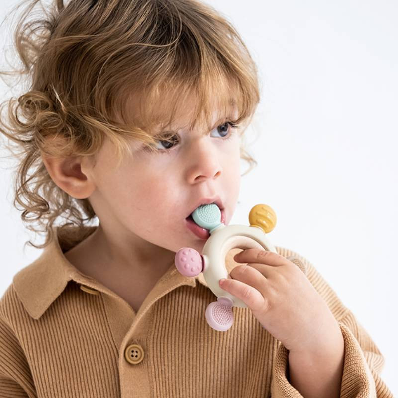 Mordedor em borracha natural com texturas e cores variadas para aliviar o desconforto da dentição e estimular os sentidos do bebé.