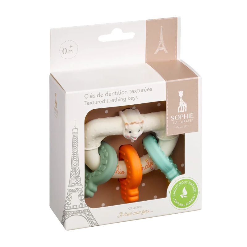 Sophie La Girafe Mordedor Chaves é feito de borracha 100% natural, ideal para aliviar as gengivas sensíveis do bebé durante a fase da dentição. Com três pequenas chaves coloridas e texturizadas, ajuda a estimular a visão, o tato e a curiosidade do bebê de forma segura e divertida.