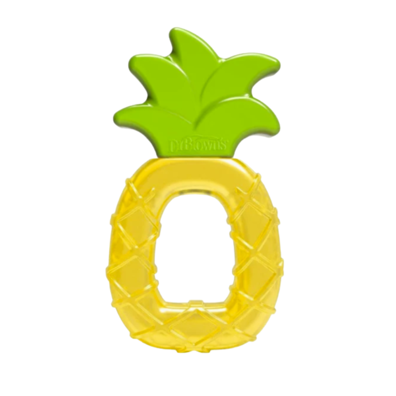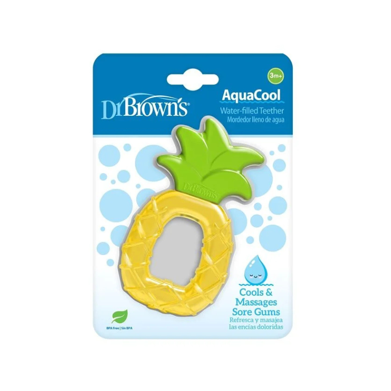 Mordedor AquaCool Ananás Dr. Brown's para bebés +3 meses. Preenchido com água purificada, alivia a dor das gengivas quando refrigerado. Extremamente resistente, fácil de agarrar e lavável na máquina de loiça. Estimula os sentidos.