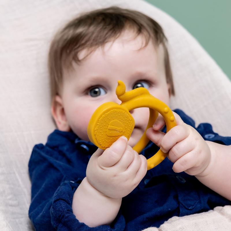 Balança quando pousado: O formato permite que o mordedor balance de um lado para o outro – um convite à repetição e à brincadeira.