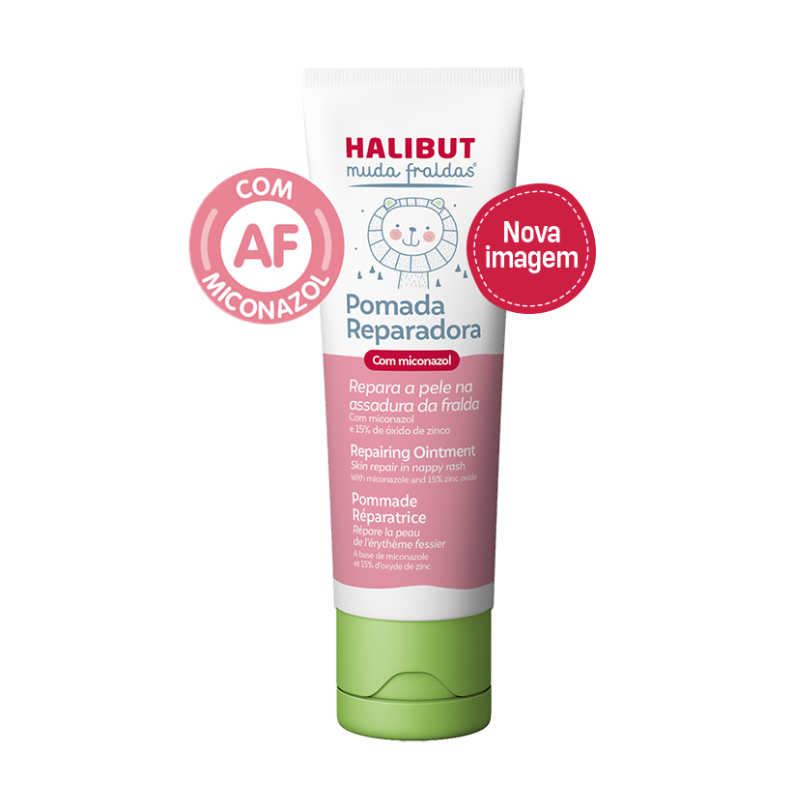 HALIBUT Muda Fraldas Pomada Reparadora alivia e repara eficazmente a pele irritada do bebé em casos de assadura da fralda. Com miconazol para controlar microrganismos e óxido de zinco com ação regeneradora, calmante e protetora.