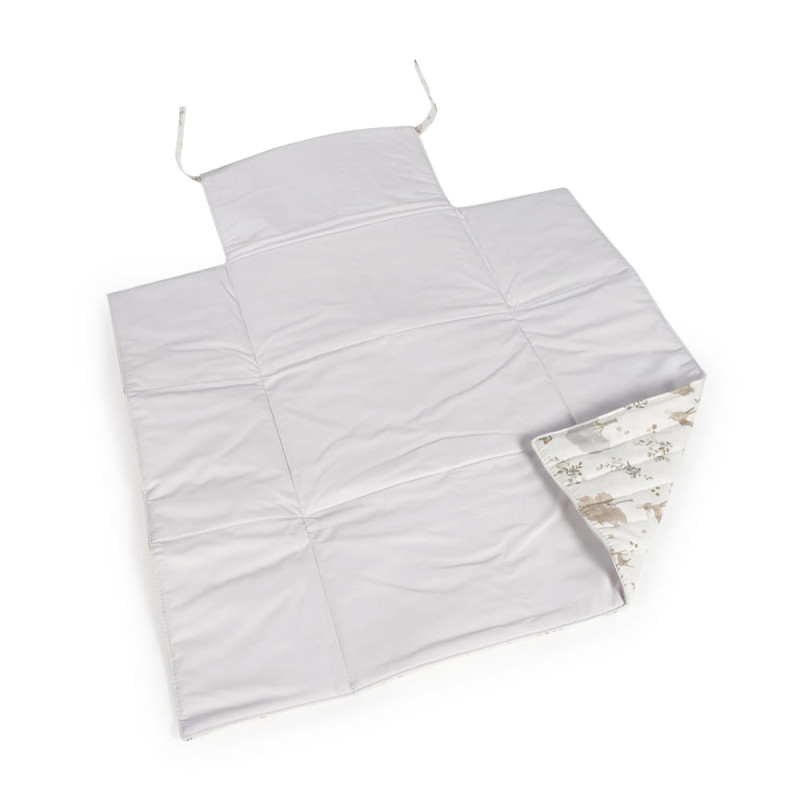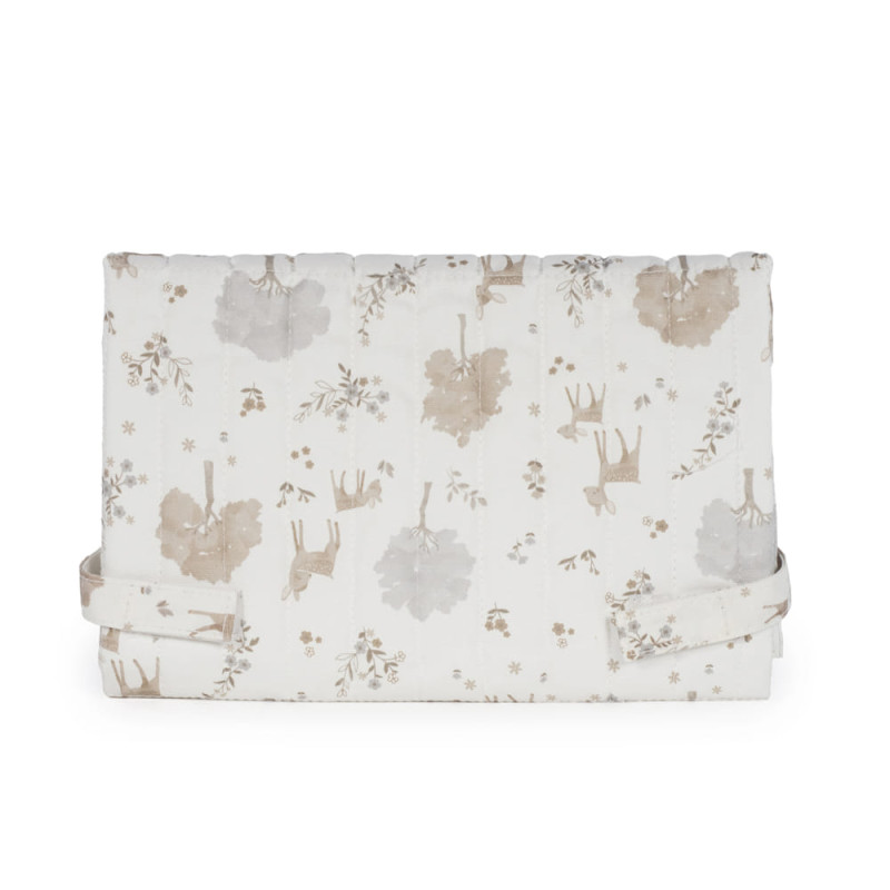 Muda fraldas Pasito a Pasito Nara em algodão 100% com estampado de cervos e árvores. Dobrável, portátil, com forro acolchoado e impermeável. Fecho em cintas de agarre. Medidas: 50x70 cm. Lavável à máquina. Livre de substâncias nocivas.