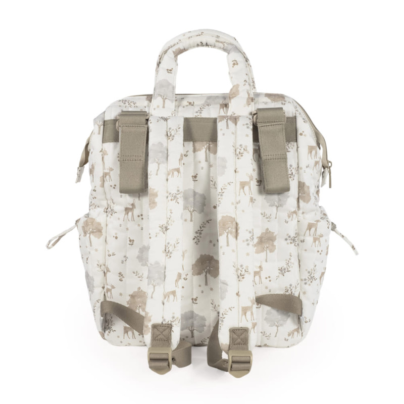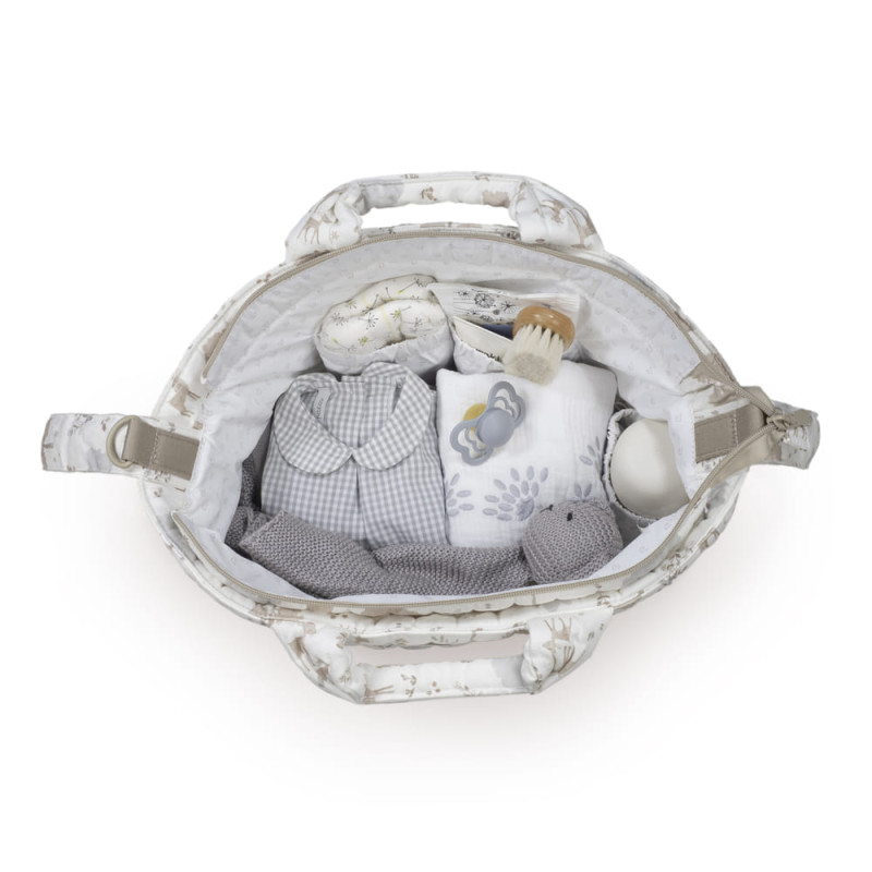 Com grande capacidade e múltiplos bolsos, permite organizar facilmente fraldas, biberões, roupa e acessórios. Inclui bolso térmico para biberões e bolso plastificado para roupa húmida, além de um prático muda-fraldas portátil.