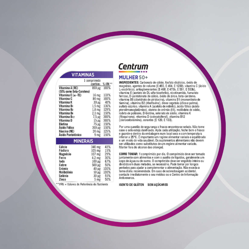 Centrum Mulher 50+ é um suplemento alimentar especialmente formulado para mulheres com mais de 50 anos. A sua composição equilibrada ajuda a suprir as necessidades nutricionais nesta fase da vida, especialmente no período pós-menopausa, apoiando a energia, imunidade, saúde óssea, da pele, cabelo e unhas.