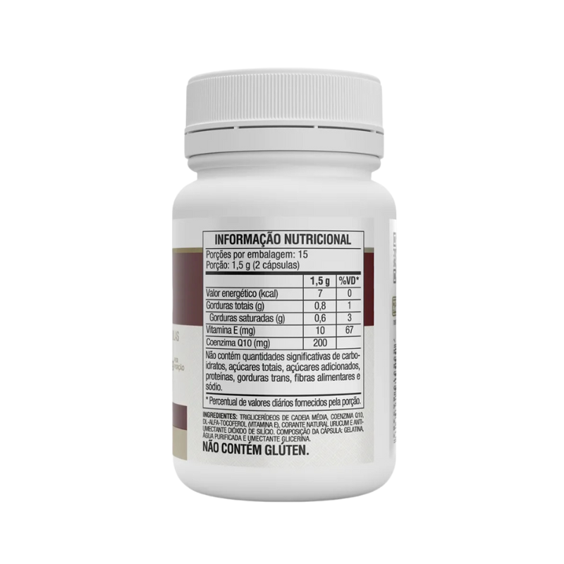 Suplemento com 200 mg de Coenzima Q10 e vitamina E, que atua como antioxidante, protegendo as células contra os radicais livres. Fórmula lipossolúvel para melhor absorção.