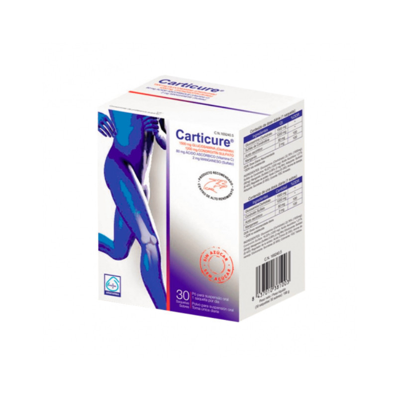 Carticure Saquetas é um suplemento alimentar com glucosamina e condroitina que contribui para o normal funcionamento das articulações ajudando a manter a sua flexibilidade e saúde. A sua fórmula contém Cloridrato de Glucosamina 1500mg, Sulfato de Condroitina 1200mg, Vitamina C 80mg e Sulfato de Manganês (2mg Mn). Sabor a laranja. Quantidade: 30 saquetas.