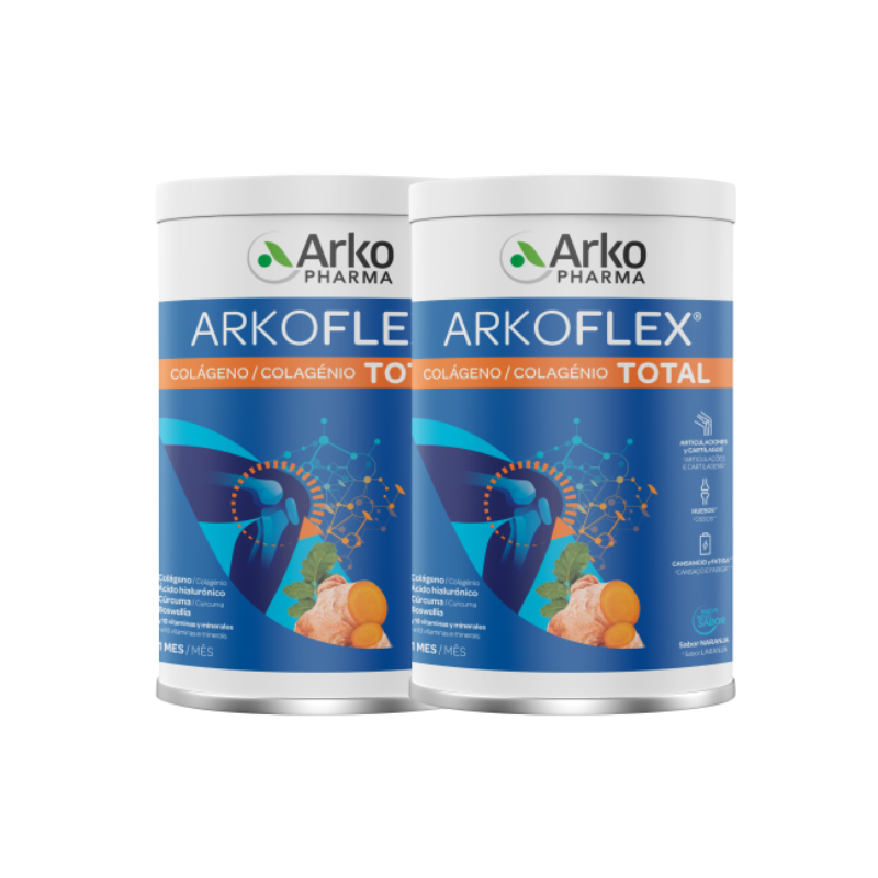 ARKOFLEX Colagénio Total é um suplemento alimentar em pó formulado para oferecer um apoio completo ao sistema locomotor. Combinando colagénio hidrolisado, colagénio nativo tipo II, ácido hialurónico, glucosamina, condroitina, plantas (Boswelia, Curcuma) e vitaminas, este suplemento proporciona uma abordagem 360º para a saúde muscular, óssea e articular.