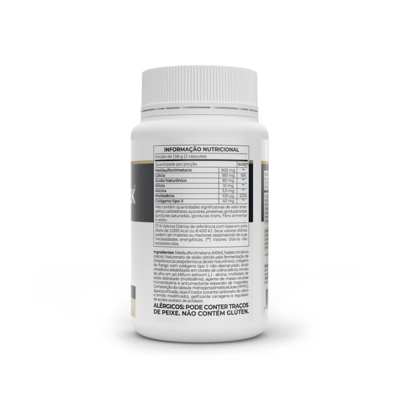 Metilsulfonilmetano (MSM), fosfato tricálcico (cálcio), extrato de alho em pó (Allium sativum L.) - alicina, colagénio de frango com colagénio tipo II não desnaturado, hialuronato de sódio obtido pela fermentação de Streptococcus zoopidemicus (ácido hialurónico), ácido ortossilícico estabilizado em cloreto de colina (silício), molibdato de sódio diidratado (molibdénio), agente de volume celulose microcristalina e antiaglomerante estearato de magnésio. Composição da cápsula: Hidroxipropilmetilcelulose (HPMC), água purificada, opacificante (corante carbonato de cálcio e amido modificado), gelificante carragenina e regulador de acidez acetato de potássio.