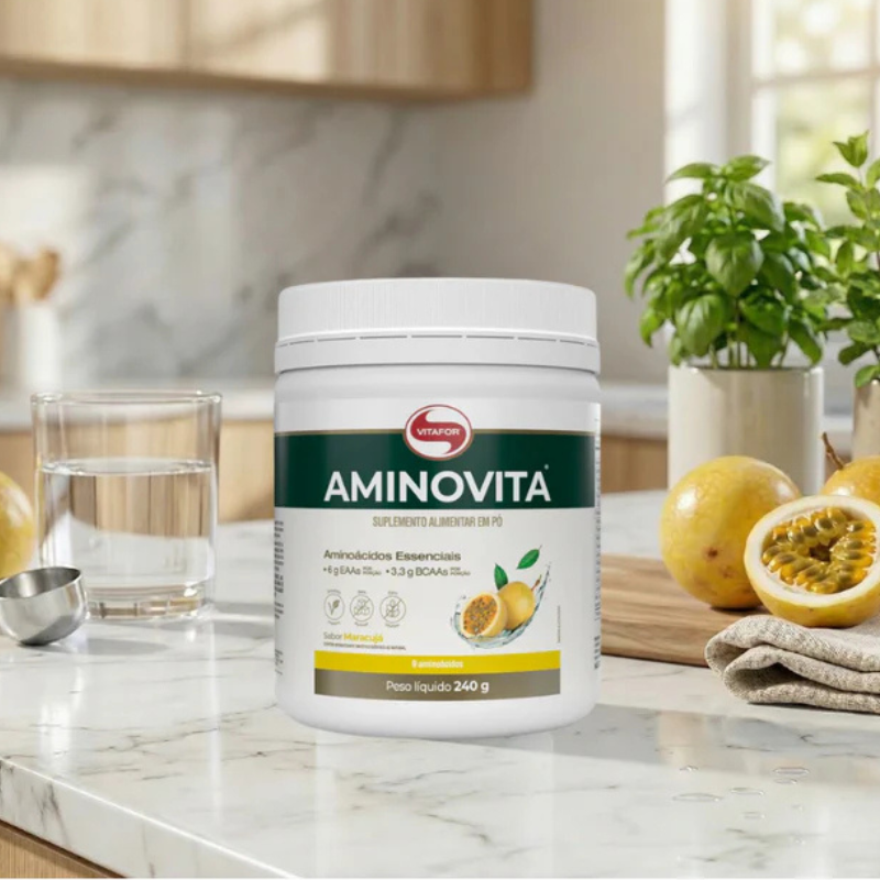 Aminovita Vitafor com 9 aminoácidos essenciais (6g por dose). Sabor maracujá, absorção ultrarrápida, 18 kcal. Acelera a recuperação muscular, previne o catabolismo, 100% vegetal, sem glúten e lactose.