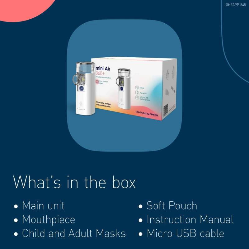 O OMRON Mini Air 360+ é um nebulizador portátil e ultracompacto que cabe no bolso. Tecnologia mesh silenciosa para tratamentos respiratórios eficazes e rápidos de tosse e constipações, em qualquer lugar. Leve, silencioso e adequado para adultos e crianças. Inclui detector de pieira e oxímetro.