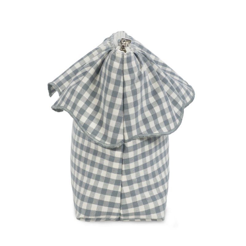 Necessaire de viagem Colima para bebé, em algodão sustentável e impermeável. Ideal para organizar fraldas, toalhitas e biberões na mala. Com fecho e pega lateral. Dimensões 17x28 cm. Prático e ecológico.