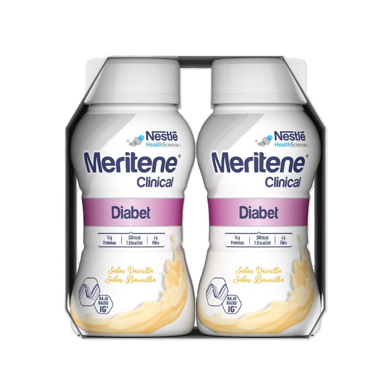 Meritene Clinical Diabet é uma solução nutricional completa, especificamente formulada para as necessidades alimentares de pessoas com diabetes. Cada embalagem de 200ml fornece nutrientes essenciais, com um baixo índice glicémico e sem adição de açúcares, ajudando a gerir os níveis de glucose no sangue.