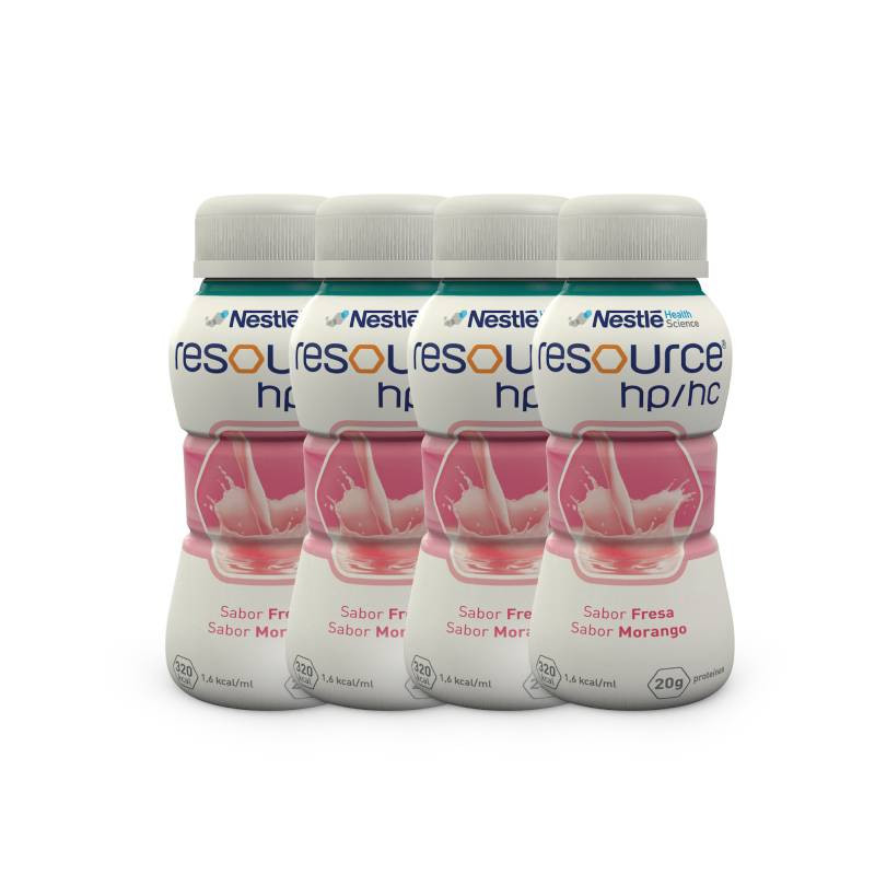 Nestlé Resource HP/HC Morango 4x200ml para indivíduos com necessidades energéticas e proteicas aumentadas e/ou patologias que levam à desnutrição. Contém todas as vitaminas, minerais e oligoelementos necessários para uma alimentação completa.