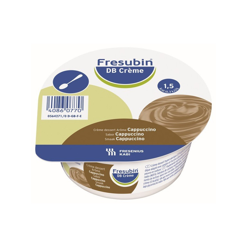 Fresubin DB Crème Creme Cappuccino 4x125g é uma embalagem composta por 4 pudins específicos para o doente diabético. Para a gestão nutricional de doentes com ou em risco de malnutrição associada à doença em particular para doentes com metabolismo da glicose alterado ou disfagia.