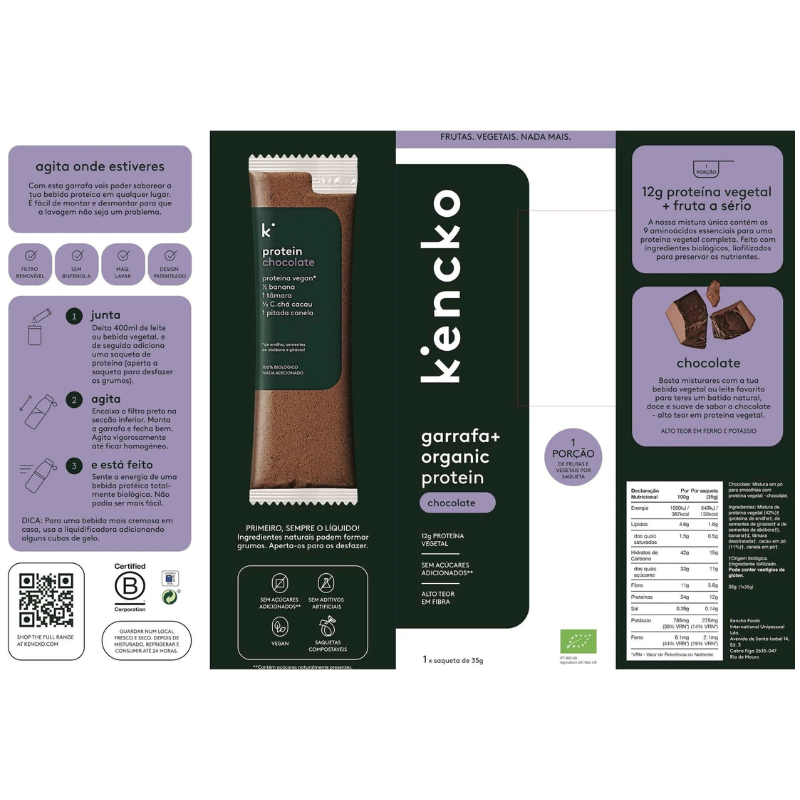 Pack Kencko com garrafa 300ml reutilizável e Smoothie BIO Proteína Vegan Chocolate 35g. Prepara batidos nutritivos em segundos, sem liquidificador. Garrafa livre de BPA, com filtro anti-grumos e lavável na máquina.