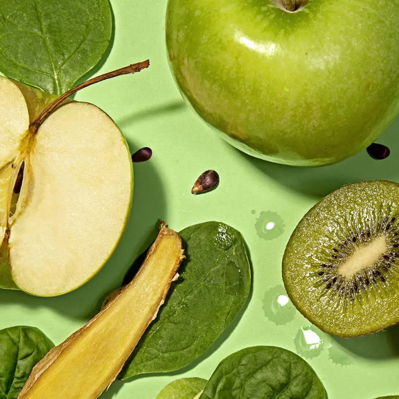 Todos os ingredientes: ananás, banana, maçã, kiwi, espinafres, couve kale, gengibre, fibra de maçã.