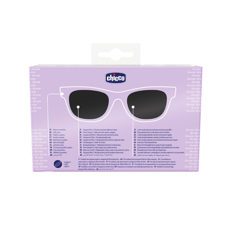 Óculos de sol Chicco para crianças a partir dos 3 anos com proteção 100% UVA e UVB. Leves, confortáveis e seguros para proteger os olhos dos mais pequenos.