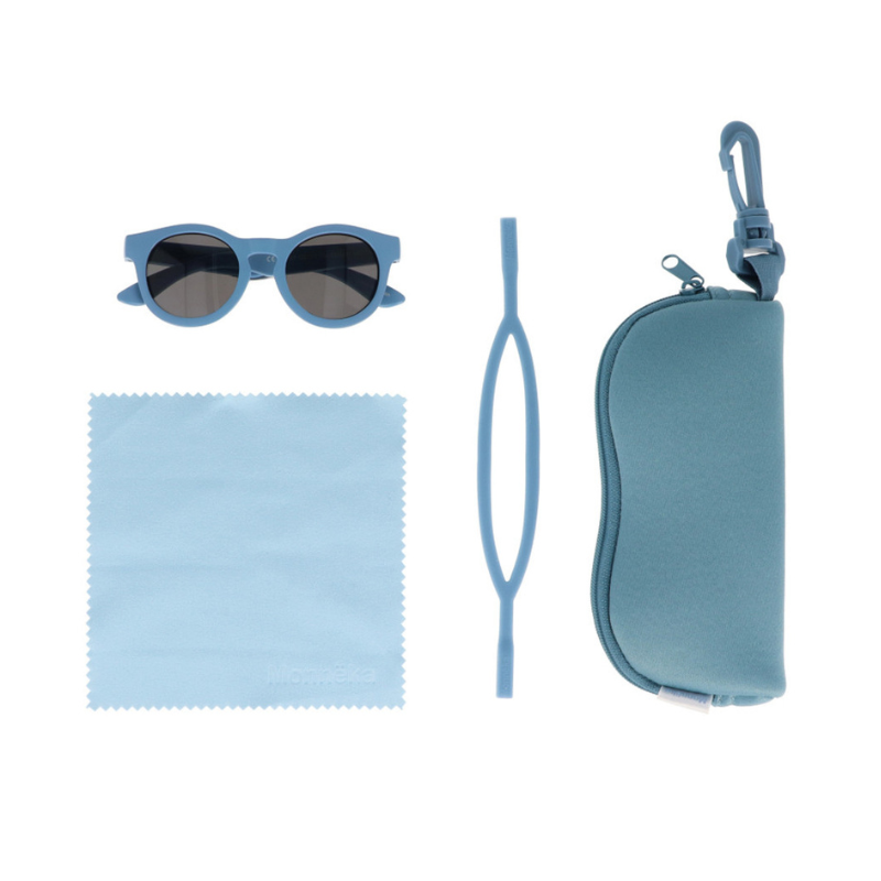 Óculos de sol Monnëka Azure com proteção UV400 (100% UVA/UVB). Policarbonato leve e resistente a impactos. Lentes antirreflexo e anti-riscos. Inclui estojo, flanela e fita de silicone. Tamanhos 3-5 anos.