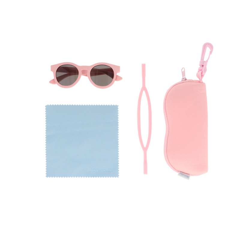 Óculos de sol Monnëka com proteção UV400 (100% UVA/UVB). Policarbonato leve e resistente a impactos. Lentes antirreflexo e anti-riscos. Inclui estojo, flanela e fita de silicone. Tamanhos 3-5 anos.
