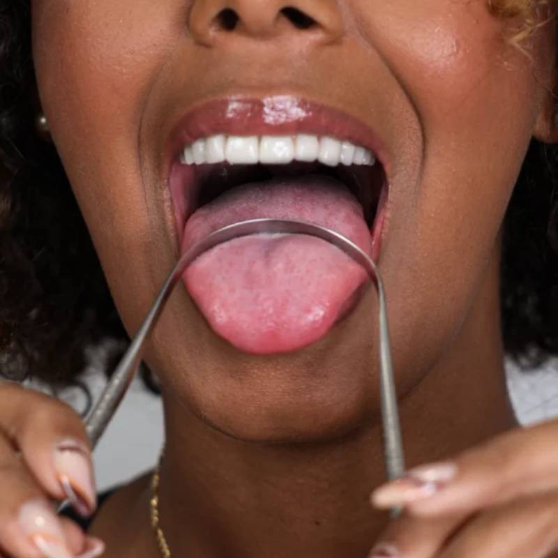 O Raspador de Língua da Elgydium remove a película bacteriana da língua, combatendo o mau hálito.