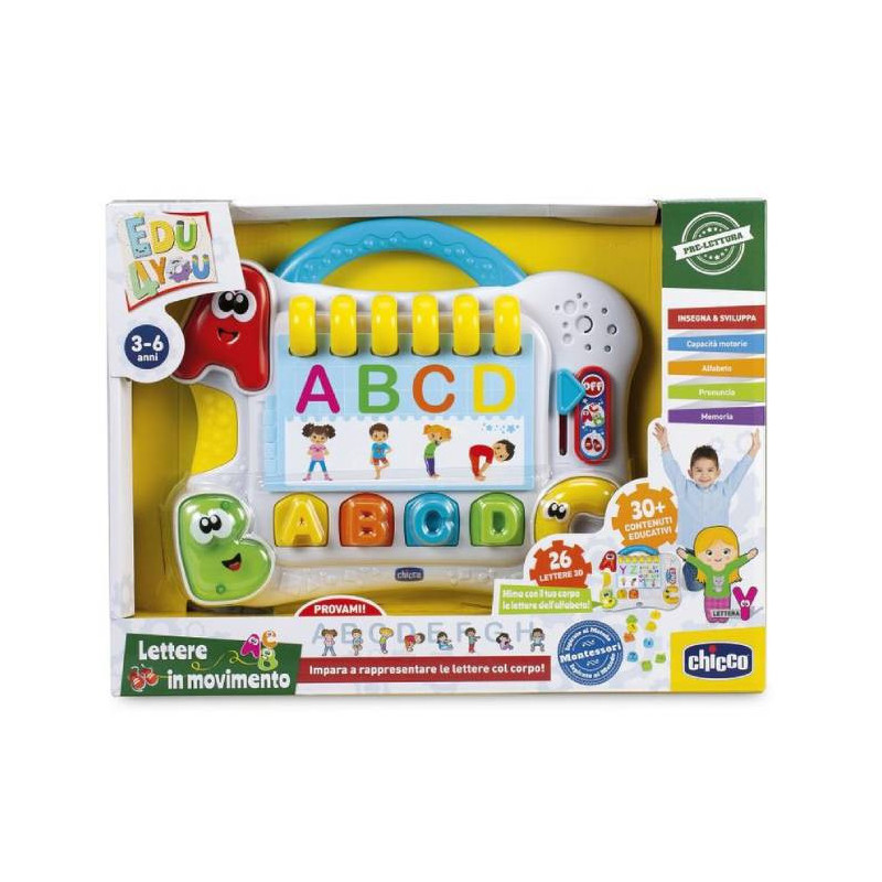 Chicco Edu4You Aprende o Alfabeto com o Corpo 3-6A é um brinquedo educativo e eletrónico, indicado para bebés entre os 3 e os 6 anos.
