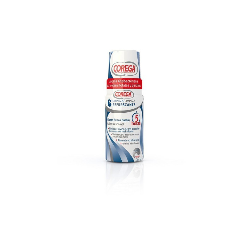 Corega Espuma de Limpeza é um cuidado para portadores de próteses dentárias, formulado para garantir uma limpeza eficaz e suave, sem imersão. Este produto contém microbolhas que ajudam a remover as manchas e elimina 99,9% das bactérias que causam o mau hálito. Possui ainda óleos de menta que proporciona uma frescura extra.