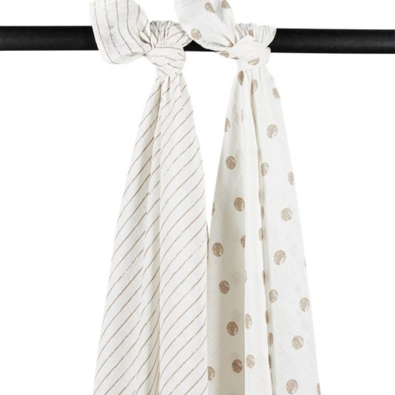 Pack de 2 musselinas em 100% algodão hidrófilo, nas cores Offwhite/Soft Sand. Macias, absorventes e multiusos. Ideais para a higiene e conforto do teu bebé.