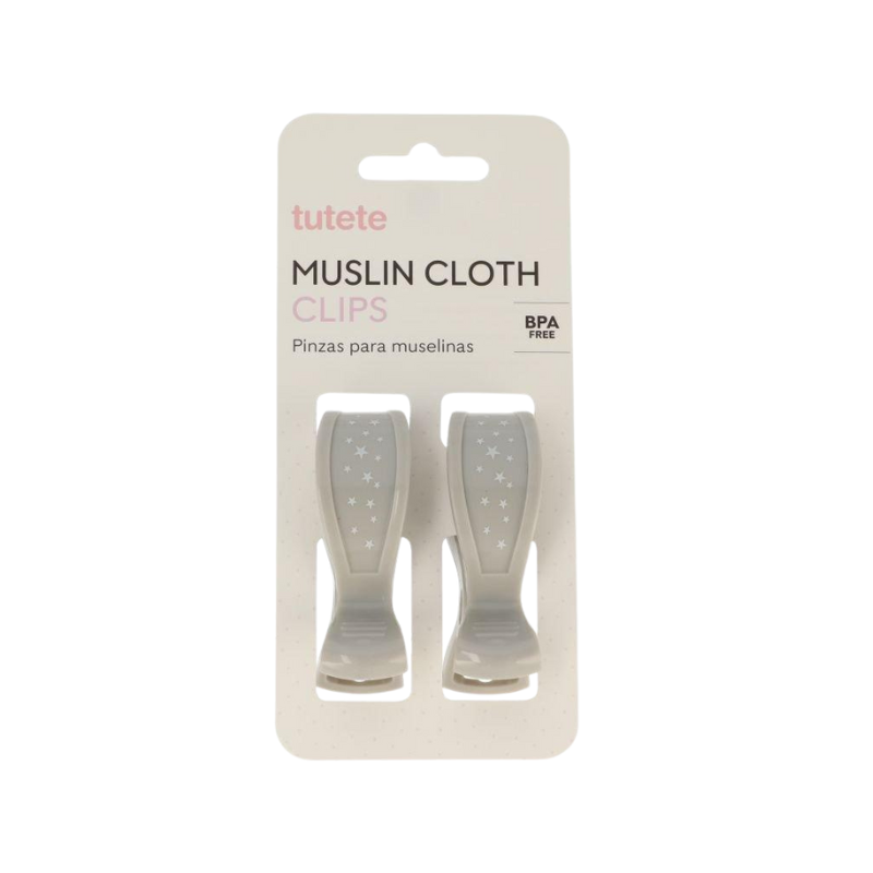As pinças para musselina Tutete Cinza são perfeitas para manter a fralda ou manta do bebé no lugar durante os passeios. Este conjunto de 2 pinças em plástico resistente e livre de BPA garante uma fixação segura ao carrinho, à cadeira auto ou ao ovo, protegendo o bebé do sol, vento ou distrações.