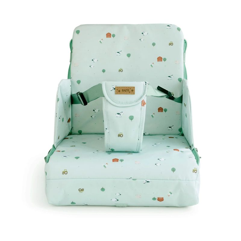 Cadeira portátil 2 em 1 que funciona como cadeira de alimentação e bolso de transporte. Adapta-se à maioria das cadeiras, tem interior acolchoado e espaço para guardar utensílios do bebé. Perfeita para refeições fora de casa.