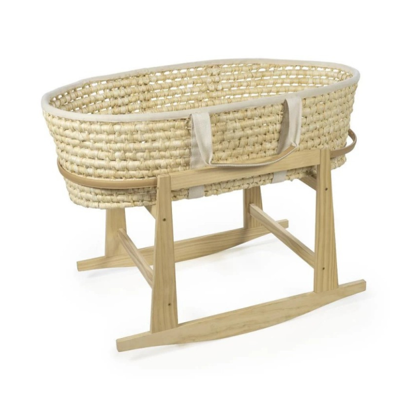 Suporte de madeira natural Walking Mum para berço de vime, transforma o berço num baloiço suave. Dimensões 74x49x49 cm, seguro, fácil de montar e elegante para o quarto do bebé.
