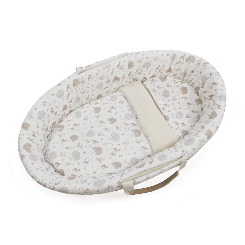 Edredão e capa: Enchimento macio para o aconchego necessário. A capa traz o estampado exclusivo da coleção Nara – cervos e árvores em tons neutros e serenos.