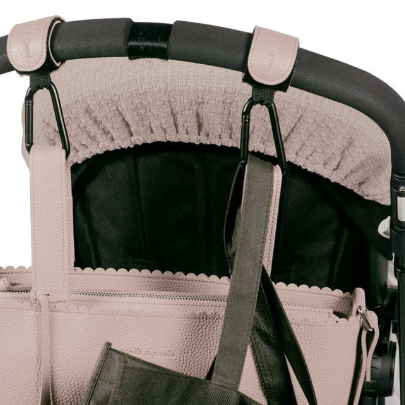 Os Ganchos para Carrinho Icon da Pasito a Pasito são a solução simples para quem precisa de mais espaço. Fixam-se em segundos, aguentam o peso (até 5 kg cada) e têm um acabamento em eco-pele que combina com o estilo do teu carrinho – e com o teu.
