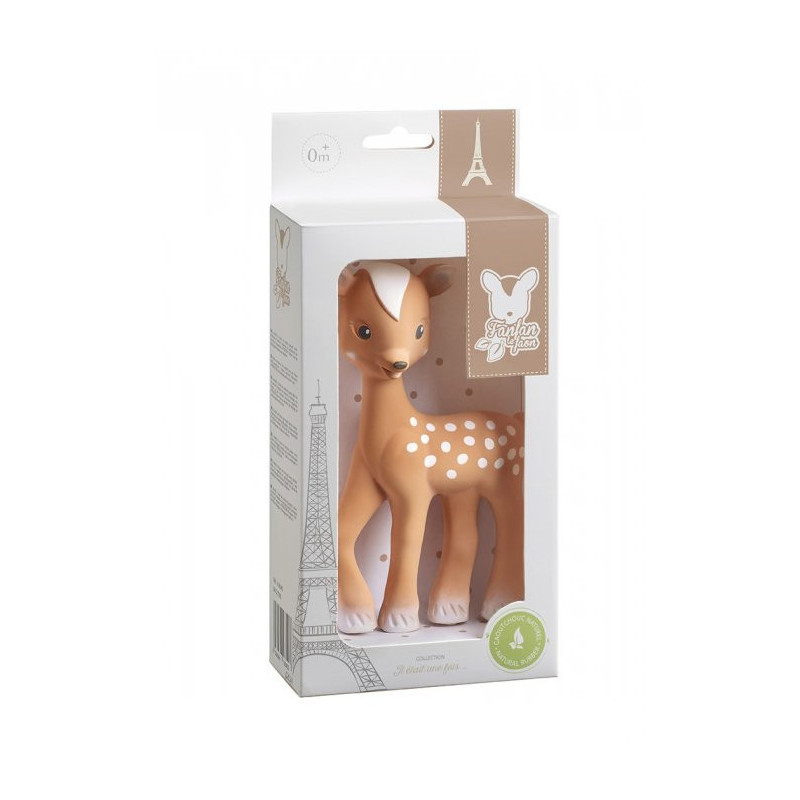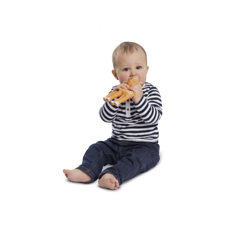 Sophie La Girafe Fanfan O Veado é um mordedor macio e ideal para aliviar as gengivas do bebé quando surgem os primeiros dentes. Fabricado à base de borracha 100% natural, retirada da seiva da árvore-da-borracha, e de pintura adequada para contacto com alimentos, é ideal para estimular todos os sentidos do bebé. Leve, está perfeitamente adaptado às mãozinhas do bebé e as patas compridas permitem agarrá-lo com facilidade. Pode ser usado desde o nascimento.