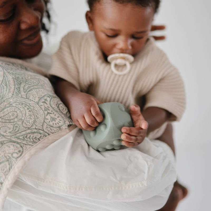 Mushie Brinquedo Dados Cambridge Blue e Shiftinf Toy +10M é um brinquedo de silicone suave, indicado para bebés a partir dos 10 meses.