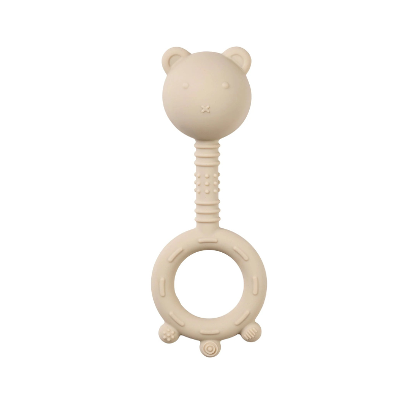 Ursinho de silicone 2 em 1: mordedor com textura que alivia as gengivas e chocalho fácil de segurar. Ideal para acalmar e entreter os bebés em qualquer lugar.