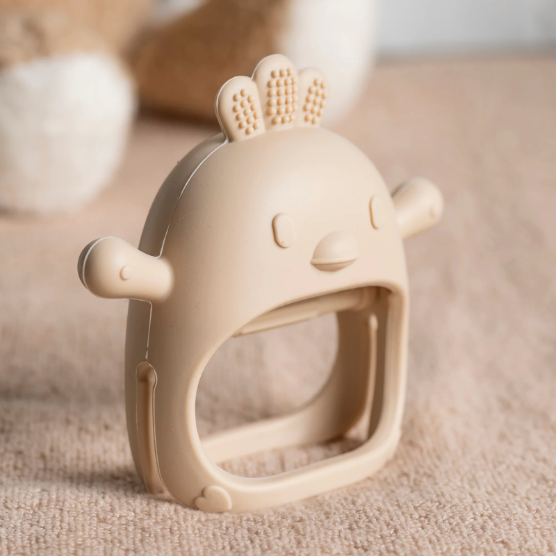 Mordedor em forma de luva, feito em silicone macio com textura que alivia a dor da dentição. Seguro, leve e fácil de agarrar — ideal para bebés desde os primeiros meses.
