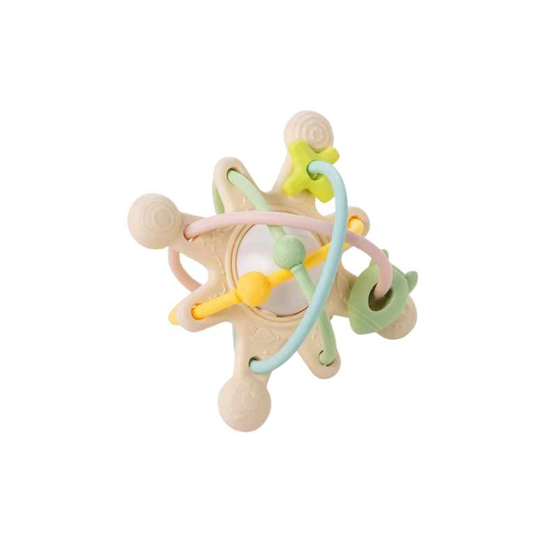 O anel de dentição Galaxy com roca integrado é perfeito para entreter e acalmar o bebé durante a fase da dentição. Com um design encantador de estrelas e planetas em tons pastel, convida o bebé a explorar com as mãos e a boca, estimulando o tato, a coordenação e o reflexo desde os primeiros meses.