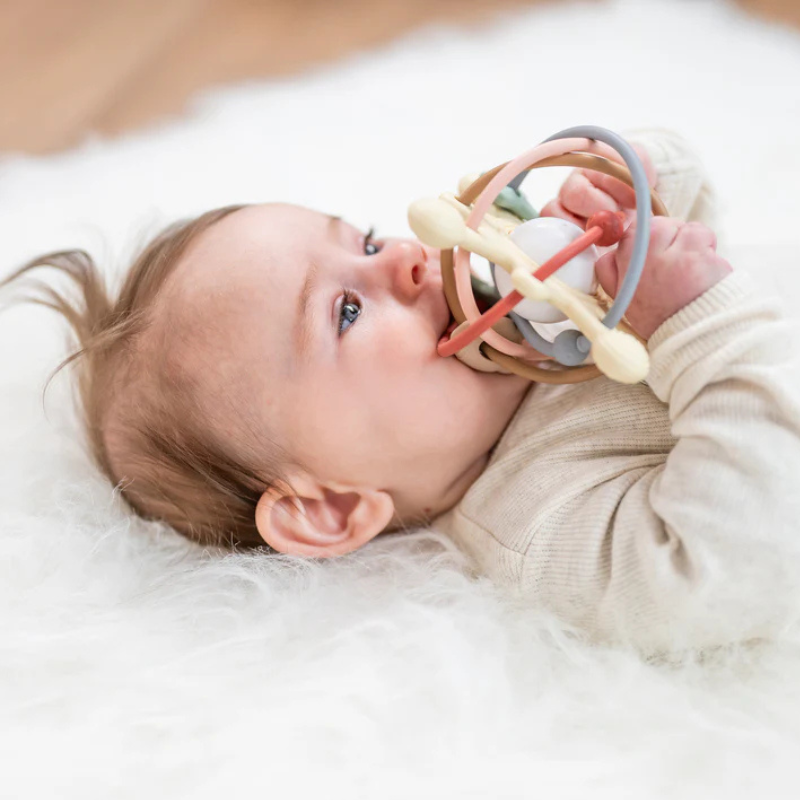 Mordedor de silicone com roca integrado em tons pastel. Estimula os sentidos e alivia a dor da dentição com um design encantador de estrelas e planetas.