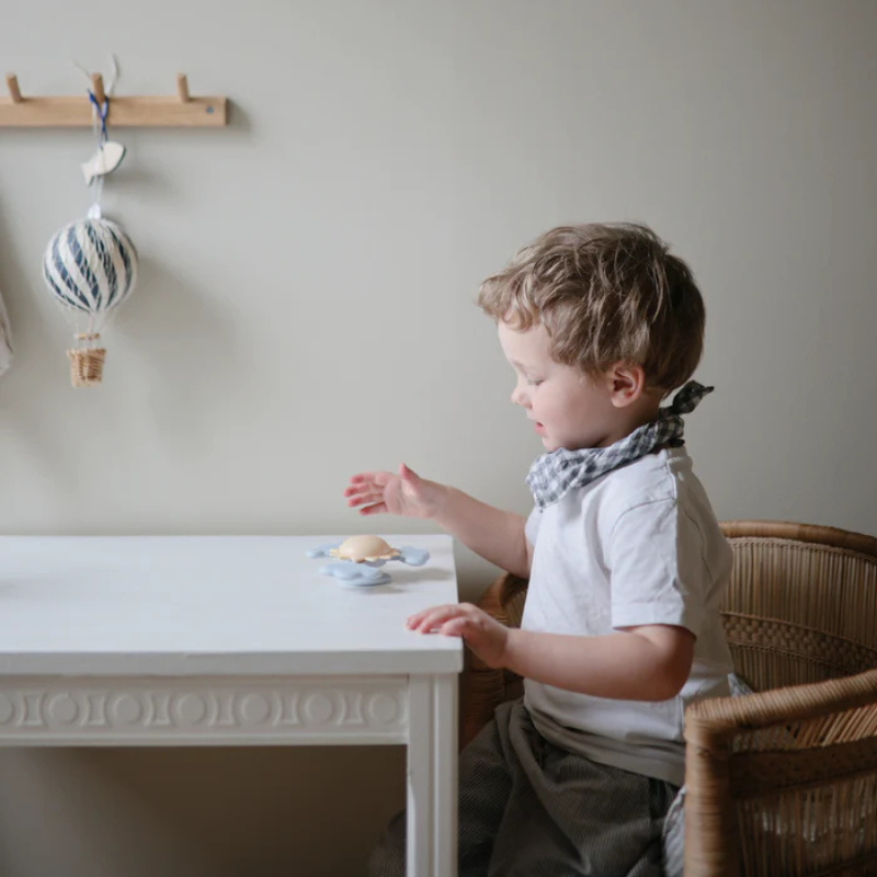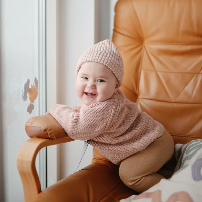 Brinquedo giratório com ventosa extra-forte que se prende a qualquer superfície lisa. As nuvens de silicone alimentar giram suavemente à volta do sol, criando um estímulo visual fascinante para o bebé. Ideal para entreter de forma segura em cadeiras de refeição, mesas de avião ou no banho. Desenvolve a coordenação motora com total segurança para bebés a partir dos 10 meses.