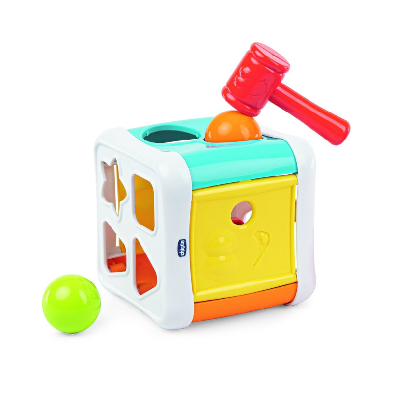 Cubo de atividades com 2 modos: encaixe de formas e martelo para bolas. Desenvolve raciocínio lógico e coordenação mão-olho. Para crianças dos 10 aos 36 meses.