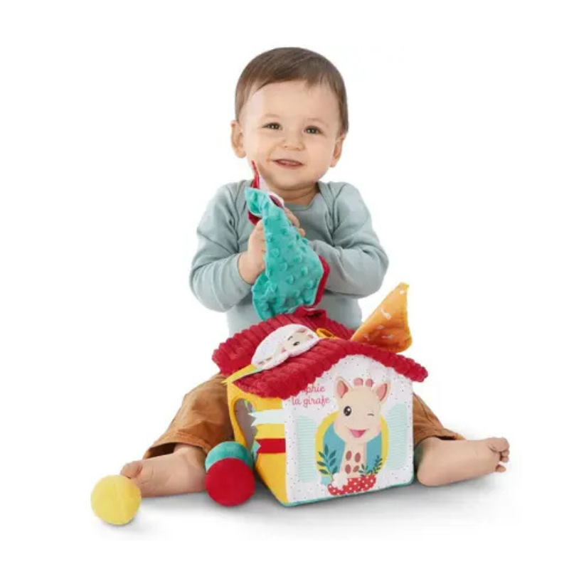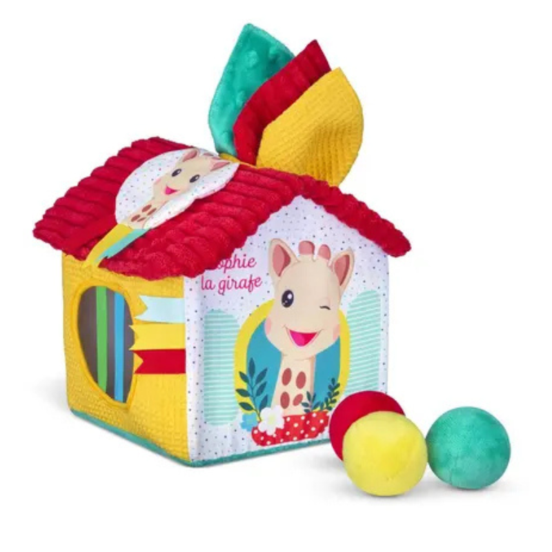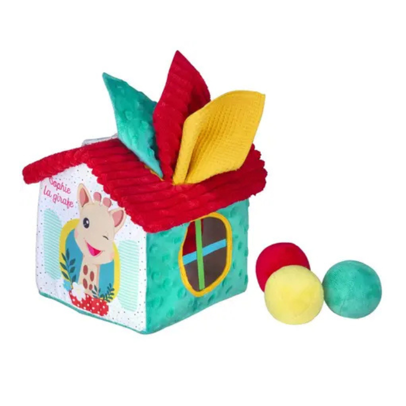 A Casa dos Descobrimentos Sophie La Girafe é um centro de atividades com 3 lenços macios e 3 bolas coloridas. Através de janelas com elásticos, o bebé desenvolve motricidade fina e sentidos. Para bebés a partir dos 10 meses.