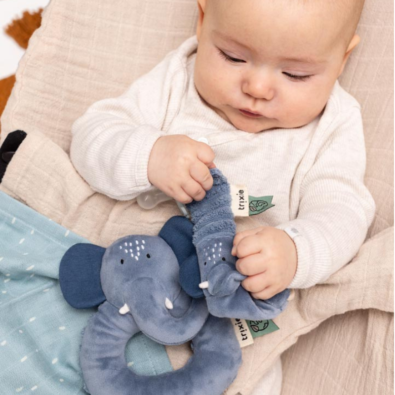 Este brinquedo sensorial foi especialmente desenvolvido para acompanhar o bebé desde os primeiros meses, proporcionando estímulos auditivos e táteis a cada movimento.